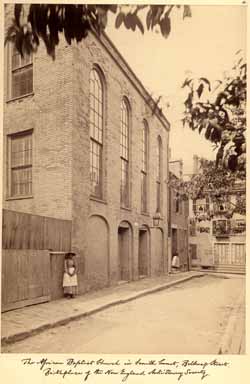 Denied access to more ample meeting places, the organizers of the New England Antislavery Society were obliged to hold their first public gathering not in Faneuil Hall, nor at the Old South Meetinghouse, nor at the Park Street Church, nor any of the well-known and accessible meeting halls of the city, but rather in the school room under the African Baptist Church (now the African Meetinghouse) on Smith Court in Boston’s black neighborhood.